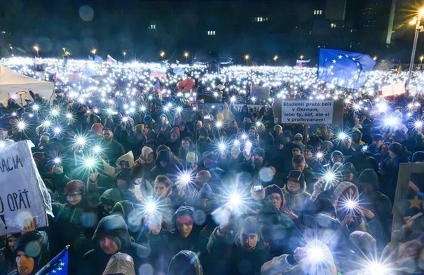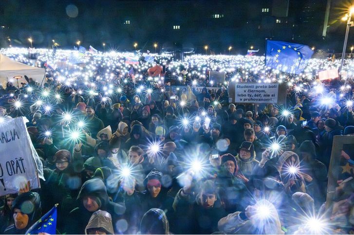 وتجمع أنصار المعارضة أمام مقر الحكومة في ساحة الحرية بوسط براتيسلافا، محتجين على سياسات حكومة روبرت فيتسو.