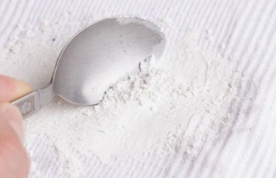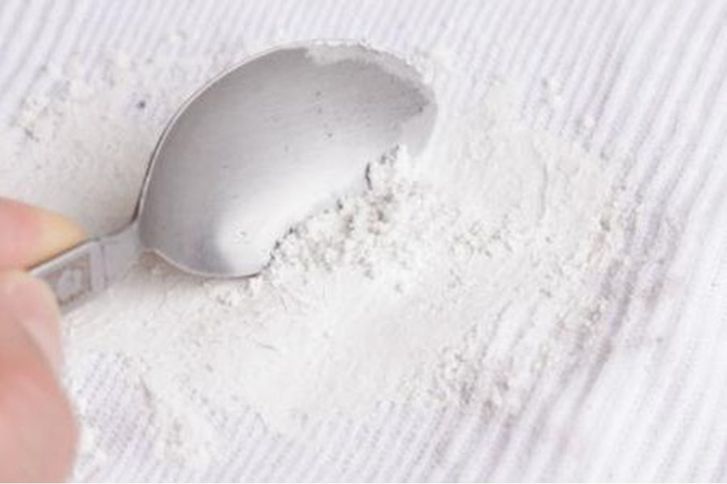 رشي القليل من النشا أو بودرة الأطفال على البقعة واتركيها 15–20 دقيقة،